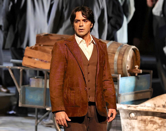 “The role of the stalwart, anti-violence professor Michele was assumed with great aplomb by Leonardo Caimi. While his peacenik presence among all this carnage may seem too good to be true, Mr. Caimi’s gleaming tenor was conversely the real deal. His lustrous vocalizing was alternately sweet and potent, as required, and his pleasant stage demeanor was perfect for this personage who really wants to calm the waters. The scene of his arrest, when his goodness is methodically demonized by Nazi’s, was a heart-wrenching highpoint of the piece”.